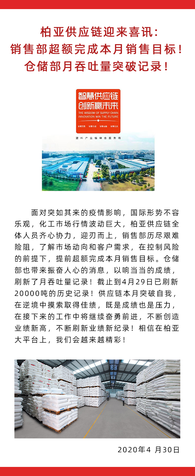 柏亚供应链重大喜讯:销售部超额完成本月销售目标!仓储部月吞吐量突破记录!