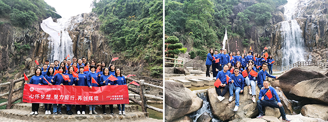 活动日一早,团队到达被誉为广东黄果树瀑布、粤东第一瀑布的汤坑镇龙归寨瀑布。全体队员发扬“不怕辛苦、连续作战”的战斗精神,不顾自驾车疲劳,一鼓作气登上释迦山。看着瀑布从崖顶上奔流而下,喷云崩雾撞向深潭,一朵朵水花溅向空中,化作云水雾。每个人脸上都绽放着胜利的喜悦。
