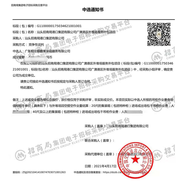 2021年4月9日,柏亚供应链控股子公司广东柏亚顺鹏集装箱服务有限公司在参加汕头招商局港口集团有限公司组织的《广澳港区外堆场服务外包项目》招标中,以良好的信誉、丰富行业经验、强大团队实力以及优秀的方案、合理的报价赢得了招标单位的肯定,顺利中标。